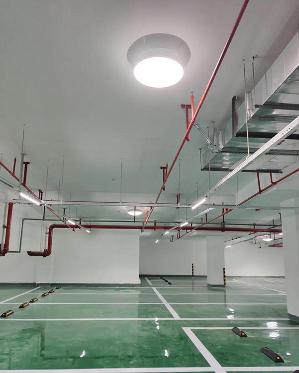 光導(dǎo)照明系統(tǒng)通過室外的采光裝置收集室外的自然光,經(jīng)過光導(dǎo)管裝置強(qiáng)化并高效傳輸?shù)绞覂?nèi)漫射器,均勻?qū)⒐饩€導(dǎo)入地下車庫,使得地下車庫的光線一直保持充足。