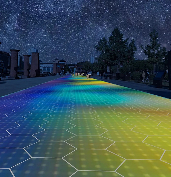 ▲光能寶盒發(fā)電地磚夜間景觀亮化效果