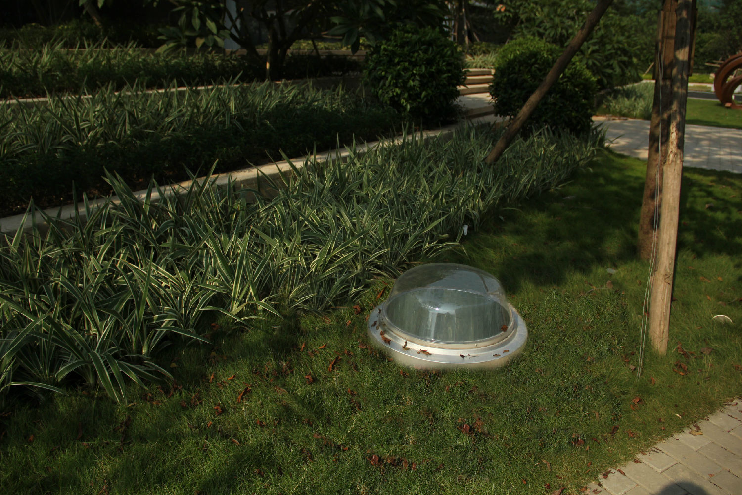 進(jìn)入金山谷創(chuàng)意園,在綠化帶、小路上可見一個個采光罩,小小的一個采光罩收集的自然光和太陽光足以照亮地下80-120平方米的室內(nèi)空間,并不會破壞建筑整體的美觀。